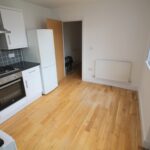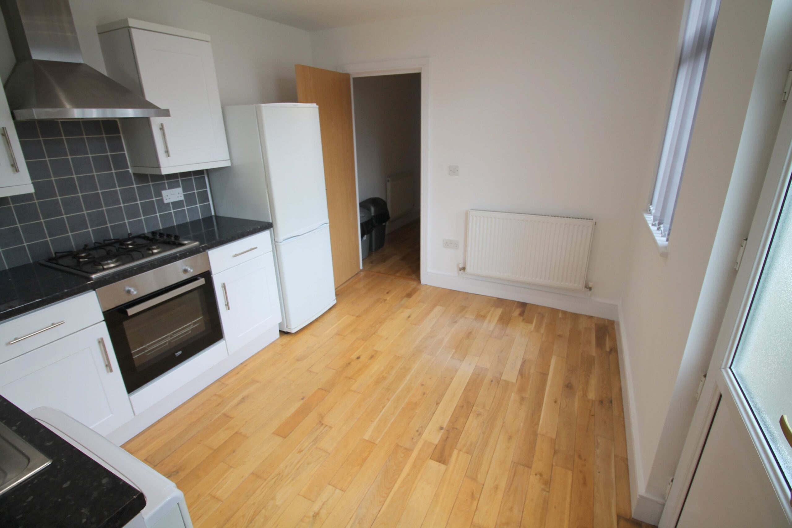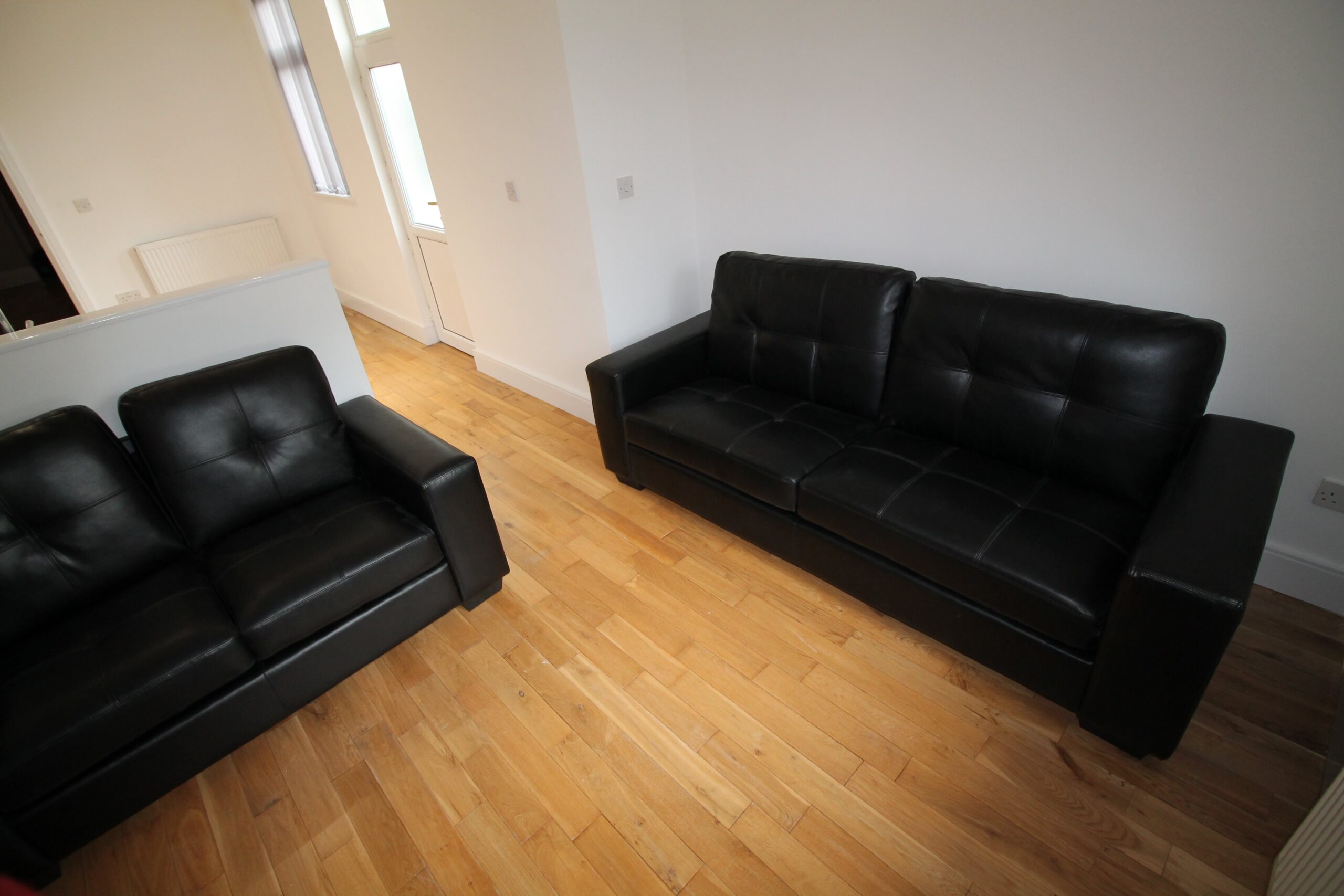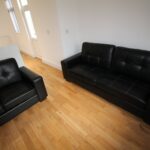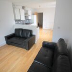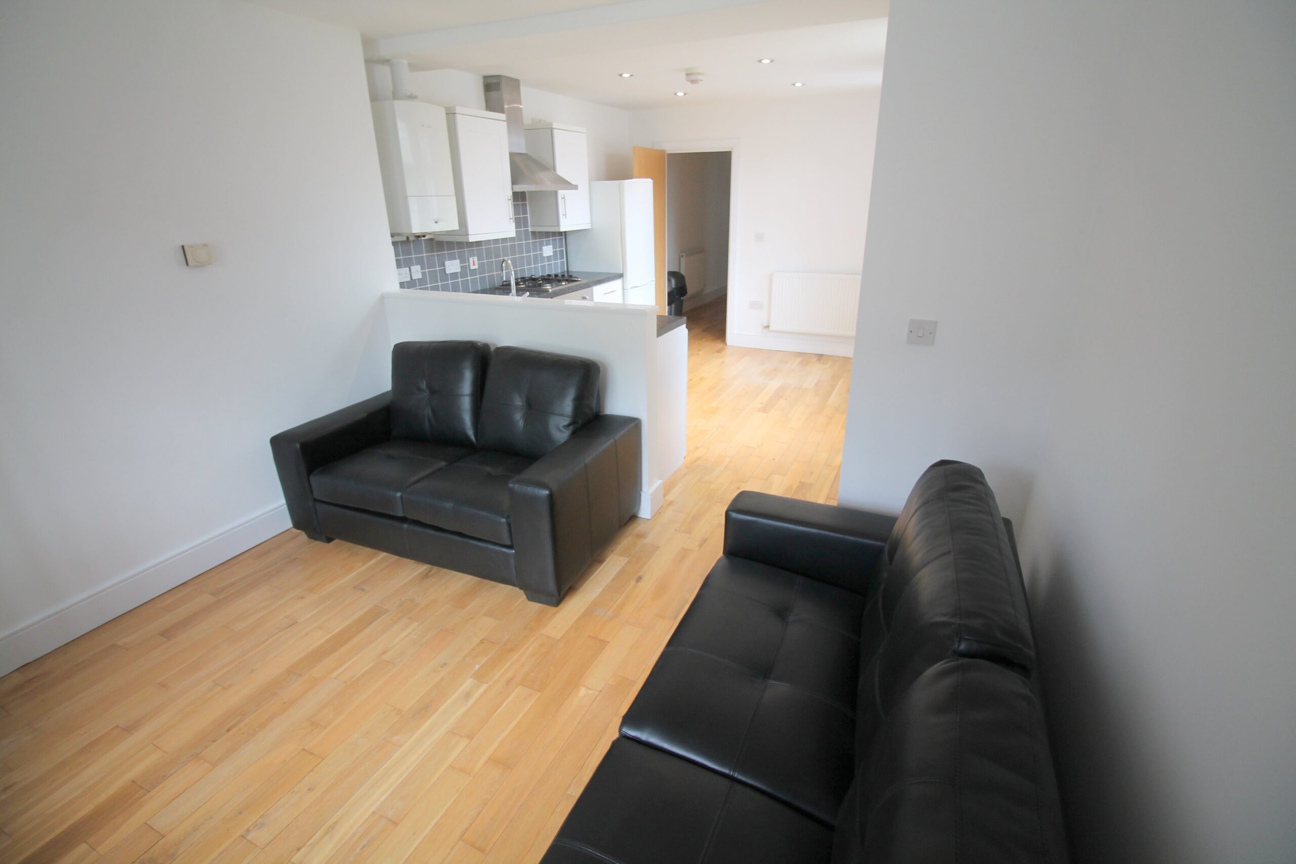 The property also offers an open plan lounge and kitchen area with oak flooring throughout, two and three seater sofas, and the kitchen is a white high-gloss finish and offers a washing machine, fridge freezer and gas oven and hob.